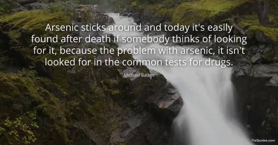 Baden, Michael. "Arsenic sticks around and today it's easily found after death if somebody thinks of looking for it, because the problem with arsenic, it isn't looked for in the common tests for drugs." FixQuotes. January 16, 2026. https://fixquotes.com/quotes/arsenic-sticks-around-and-today-its-easily-found-127760/.