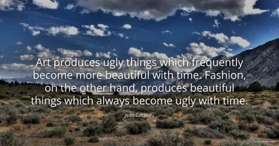 Cocteau, Jean. (2026, January 16). Art produces ugly things which frequently become more beautiful with time. Fashion, on the other hand, produces beautiful things which always become ugly with time. FixQuotes. https://fixquotes.com/quotes/art-produces-ugly-things-which-frequently-become-127119/