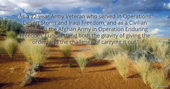 West, Allen. (2026, January 17). As a 22-year Army Veteran who served in Operations Desert Storm and Iraqi Freedom, and as a Civilian Advisor to the Afghan Army in Operation Enduring Freedom, I understand both the gravity of giving the order, and the challenge of carrying it out. FixQuotes. https://fixquotes.com/quotes/as-a-22-year-army-veteran-who-served-in-36646/