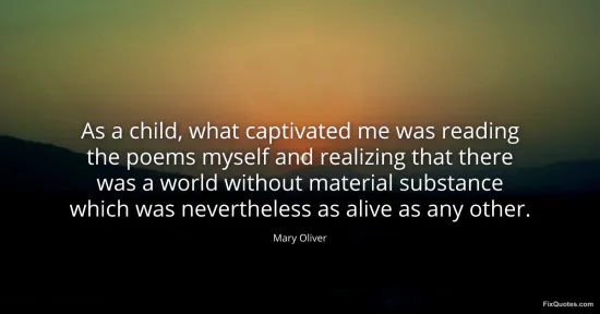 Oliver, Mary. "As a child, what captivated me was reading the poems myself and realizing that there was a world without material substance which was nevertheless as alive as any other." FixQuotes. January 16, 2026. https://fixquotes.com/quotes/as-a-child-what-captivated-me-was-reading-the-97128/.