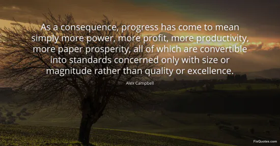Campbell, Alex. (2026, January 17). As a consequence, progress has come to mean simply more power, more profit, more productivity, more paper prosperity, all of which are convertible into standards concerned only with size or magnitude rather than quality or excellence. FixQuotes. https://fixquotes.com/quotes/as-a-consequence-progress-has-come-to-mean-simply-36859/