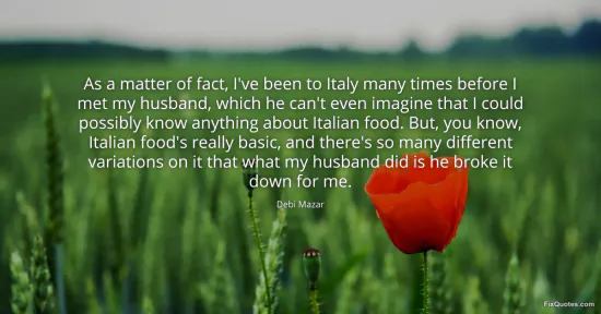 Mazar, Debi. "As a matter of fact, I've been to Italy many times before I met my husband, which he can't even imagine that I could possibly know anything about Italian food. But, you know, Italian food's really basic, and there's so many different variations on it that what my husband did is he broke it down for me." FixQuotes. January 15, 2026. https://fixquotes.com/quotes/as-a-matter-of-fact-ive-been-to-italy-many-times-145354/.