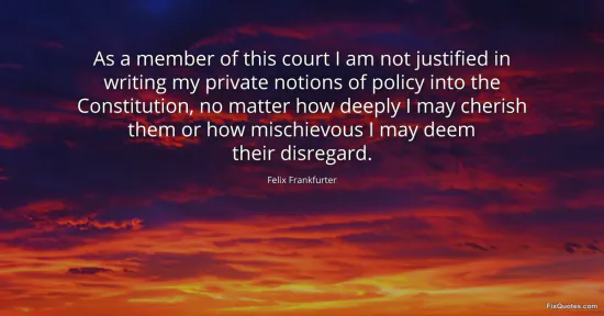 Frankfurter, Felix. (2026, January 15). As a member of this court I am not justified in writing my private notions of policy into the Constitution, no matter how deeply I may cherish them or how mischievous I may deem their disregard. FixQuotes. https://fixquotes.com/quotes/as-a-member-of-this-court-i-am-not-justified-in-146266/