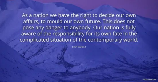 Walesa, Lech. "As a nation we have the right to decide our own affairs, to mould our own future. This does not pose any danger to anybody. Our nation is fully aware of the responsibility for its own fate in the complicated situation of the contemporary world." FixQuotes. January 16, 2026. https://fixquotes.com/quotes/as-a-nation-we-have-the-right-to-decide-our-own-114718/.