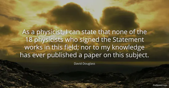 Douglass, David. (2026, January 17). As a physicist, I can state that none of the 18 physicists who signed the Statement works in this field; nor to my knowledge has ever published a paper on this subject. FixQuotes. https://fixquotes.com/quotes/as-a-physicist-i-can-state-that-none-of-the-18-45608/