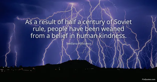 Alliluyeva, Svetlana. "As a result of half a century of Soviet rule, people have been weaned from a belief in human kindness." FixQuotes. February 18, 2026. https://fixquotes.com/quotes/as-a-result-of-half-a-century-of-soviet-rule-65886/.