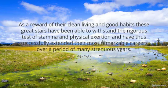 Taylor, Major. "As a reward of their clean living and good habits these great stars have been able to withstand the rigorous test of stamina and physical exertion and have thus successfully extended their most remarkable careers over a period of many strenuous years." FixQuotes. January 17, 2026. https://fixquotes.com/quotes/as-a-reward-of-their-clean-living-and-good-habits-77283/.