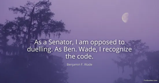 Wade, Benjamin F. "As a Senator, I am opposed to duelling. As Ben. Wade, I recognize the code." FixQuotes. February 19, 2026. https://fixquotes.com/quotes/as-a-senator-i-am-opposed-to-duelling-as-ben-wade-39048/.