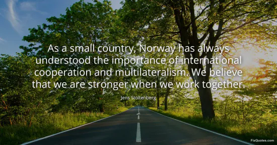 Stoltenberg, Jens. (n.d.). As a small country, Norway has always understood the importance of international cooperation and multilateralism. We believe that we are stronger when we work together. FixQuotes. https://fixquotes.com/quotes/as-a-small-country-norway-has-always-understood-172259/