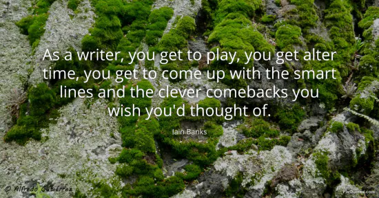 Banks, Iain. "As a writer, you get to play, you get alter time, you get to come up with the smart lines and the clever comebacks you wish you'd thought of." FixQuotes. January 18, 2026. https://fixquotes.com/quotes/as-a-writer-you-get-to-play-you-get-alter-time-20911/.