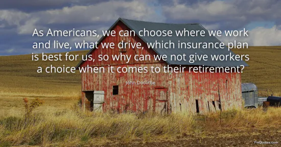 Doolittle, John. "As Americans, we can choose where we work and live, what we drive, which insurance plan is best for us, so why can we not give workers a choice when it comes to their retirement?" FixQuotes. January 17, 2026. https://fixquotes.com/quotes/as-americans-we-can-choose-where-we-work-and-live-80419/.