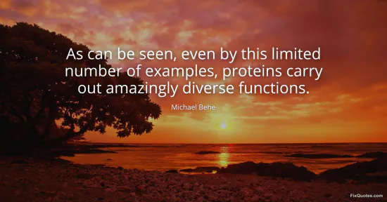 "As can be seen, even by this limited number of examples, proteins carry out amazingly diverse functions." FixQuotes, 16 Feb. 2026, https://fixquotes.com/quotes/as-can-be-seen-even-by-this-limited-number-of-57856/. Accessed 22 Feb. 2026.