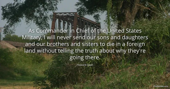 Dean, Howard. (2026, January 17). As Commander in Chief of the United States Military, I will never send our sons and daughters and our brothers and sisters to die in a foreign land without telling the truth about why they're going there. FixQuotes. https://fixquotes.com/quotes/as-commander-in-chief-of-the-united-states-49467/