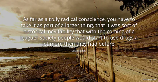 Bangs, Lester. (2026, January 15). As far as a truly radical conscience, you have to take it as part of a larger thing, that it was sort of historical inevitability that with the coming of a leaguer society people would start to use drugs a lot more then they had before. FixQuotes. https://fixquotes.com/quotes/as-far-as-a-truly-radical-conscience-you-have-to-157926/