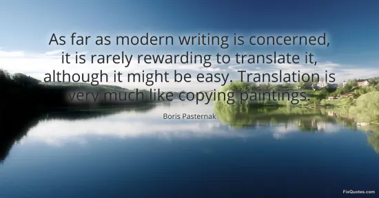 Pasternak, Boris. (2026, January 18). As far as modern writing is concerned, it is rarely rewarding to translate it, although it might be easy. Translation is very much like copying paintings. FixQuotes. https://fixquotes.com/quotes/as-far-as-modern-writing-is-concerned-it-is-7155/