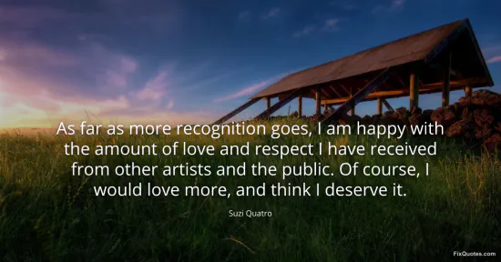 Quatro, Suzi. (2026, January 16). As far as more recognition goes, I am happy with the amount of love and respect I have received from other artists and the public. Of course, I would love more, and think I deserve it. FixQuotes. https://fixquotes.com/quotes/as-far-as-more-recognition-goes-i-am-happy-with-95928/