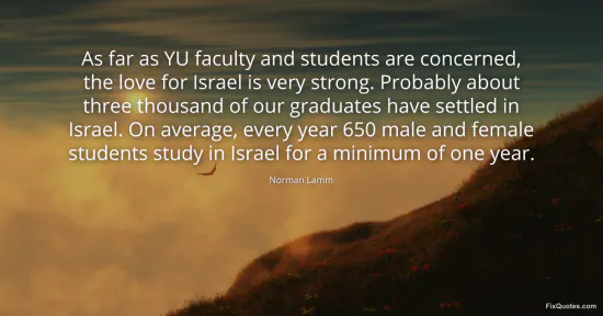 Lamm, Norman. (2026, January 16). As far as YU faculty and students are concerned, the love for Israel is very strong. Probably about three thousand of our graduates have settled in Israel. On average, every year 650 male and female students study in Israel for a minimum of one year. FixQuotes. https://fixquotes.com/quotes/as-far-as-yu-faculty-and-students-are-concerned-86492/