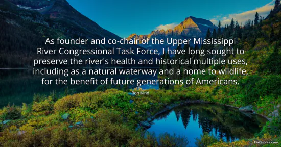 Kind, Ron. (2026, February 17). As founder and co-chair of the Upper Mississippi River Congressional Task Force, I have long sought to preserve the river's health and historical multiple uses, including as a natural waterway and a home to wildlife, for the benefit of future generations of Americans. FixQuotes. https://fixquotes.com/quotes/as-founder-and-co-chair-of-the-upper-mississippi-97006/