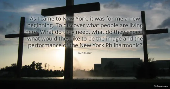 Masur, Kurt. "As I came to New York, it was for me a new beginning. To discover what people are living here. What do they need, what do they expect, what would they like to be the image and the performance of the New York Philharmonic?" FixQuotes. January 17, 2026. https://fixquotes.com/quotes/as-i-came-to-new-york-it-was-for-me-a-new-72250/.