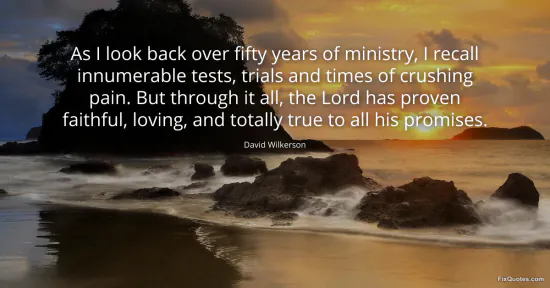 Wilkerson, David. (2026, January 17). As I look back over fifty years of ministry, I recall innumerable tests, trials and times of crushing pain. But through it all, the Lord has proven faithful, loving, and totally true to all his promises. FixQuotes. https://fixquotes.com/quotes/as-i-look-back-over-fifty-years-of-ministry-i-45270/