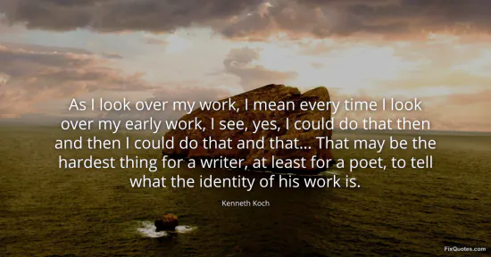 Koch, Kenneth. (2026, January 17). As I look over my work, I mean every time I look over my early work, I see, yes, I could do that then and then I could do that and that... That may be the hardest thing for a writer, at least for a poet, to tell what the identity of his work is. FixQuotes. https://fixquotes.com/quotes/as-i-look-over-my-work-i-mean-every-time-i-look-68845/