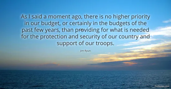 Ryun, Jim. "As I said a moment ago, there is no higher priority in our budget, or certainly in the budgets of the past few years, than providing for what is needed for the protection and security of our country and support of our troops." FixQuotes. January 17, 2026. https://fixquotes.com/quotes/as-i-said-a-moment-ago-there-is-no-higher-57193/.