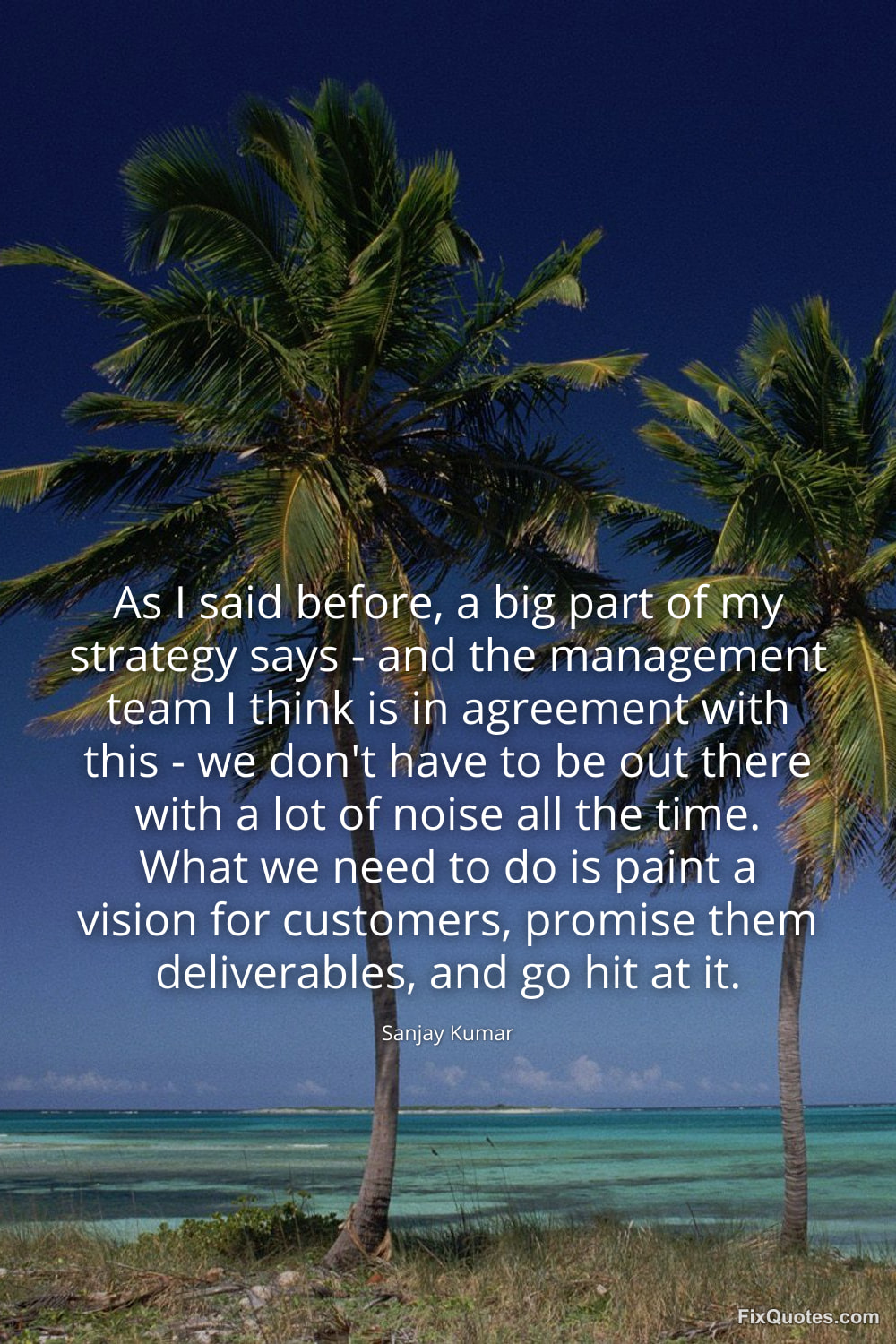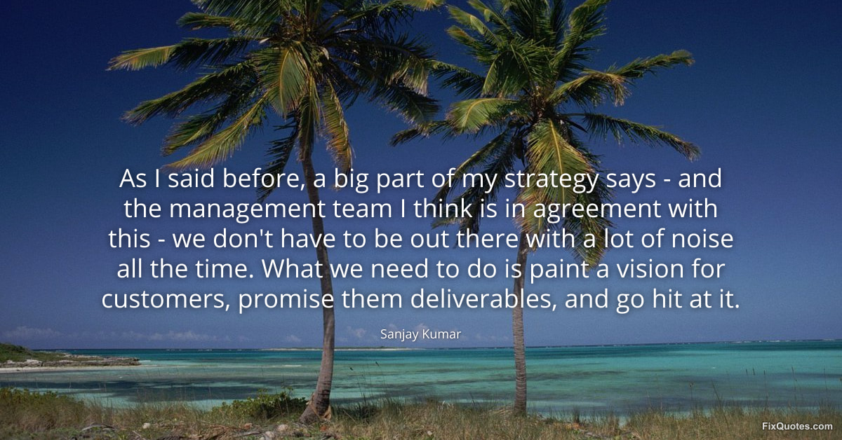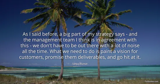 Kumar, Sanjay. (2026, January 16). As I said before, a big part of my strategy says - and the management team I think is in agreement with this - we don't have to be out there with a lot of noise all the time. What we need to do is paint a vision for customers, promise them deliverables, and go hit at it. FixQuotes. https://fixquotes.com/quotes/as-i-said-before-a-big-part-of-my-strategy-says-115947/