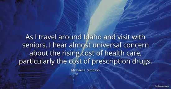 Simpson, Michael K. "As I travel around Idaho and visit with seniors, I hear almost universal concern about the rising cost of health care, particularly the cost of prescription drugs." FixQuotes. January 16, 2026. https://fixquotes.com/quotes/as-i-travel-around-idaho-and-visit-with-seniors-i-88936/.