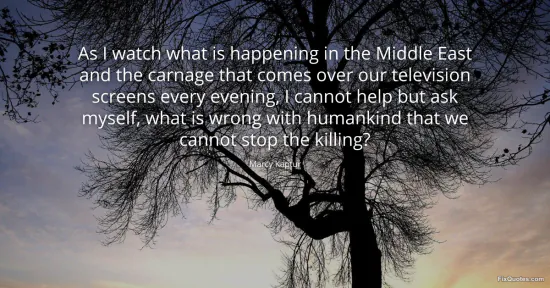 Kaptur, Marcy. "As I watch what is happening in the Middle East and the carnage that comes over our television screens every evening, I cannot help but ask myself, what is wrong with humankind that we cannot stop the killing?" FixQuotes. January 16, 2026. https://fixquotes.com/quotes/as-i-watch-what-is-happening-in-the-middle-east-104049/.