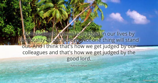 Emanuel, Rahm. (2026, January 15). As individuals, we will be judged in our lives by the totality of our actions. Not one thing will stand out. And I think that's how we get judged by our colleagues and that's how we get judged by the good lord. FixQuotes. https://fixquotes.com/quotes/as-individuals-we-will-be-judged-in-our-lives-by-157056/