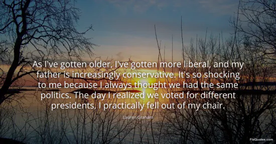 Graham, Lauren. "As I've gotten older, I've gotten more liberal, and my father is increasingly conservative. It's so shocking to me because I always thought we had the same politics. The day I realized we voted for different presidents, I practically fell out of my chair." FixQuotes. January 15, 2026. https://fixquotes.com/quotes/as-ive-gotten-older-ive-gotten-more-liberal-and-166180/.