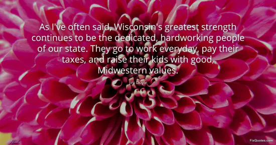 Doyle, Jim. "As I've often said, Wisconsin's greatest strength continues to be the dedicated, hardworking people of our state. They go to work everyday, pay their taxes, and raise their kids with good, Midwestern values." FixQuotes. January 17, 2026. https://fixquotes.com/quotes/as-ive-often-said-wisconsins-greatest-strength-73950/.