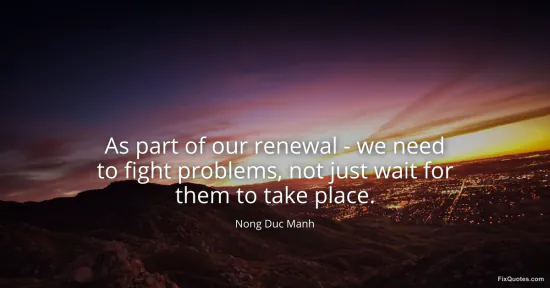 Manh, Nong Duc. "As part of our renewal - we need to fight problems, not just wait for them to take place." FixQuotes. January 15, 2026. https://fixquotes.com/quotes/as-part-of-our-renewal-we-need-to-fight-164335/.