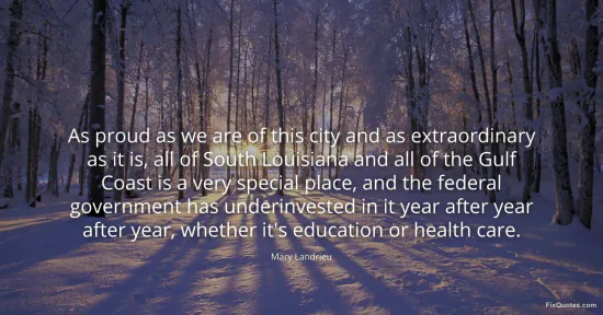 Landrieu, Mary. (2026, February 18). As proud as we are of this city and as extraordinary as it is, all of South Louisiana and all of the Gulf Coast is a very special place, and the federal government has underinvested in it year after year after year, whether it's education or health care. FixQuotes. https://fixquotes.com/quotes/as-proud-as-we-are-of-this-city-and-as-71106/