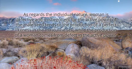 Aquinas, Thomas. "As regards the individual nature, woman is defective and misbegotten, for the active power of the male seed tends to the production of a perfect likeness in the masculine sex; while the production of a woman comes from defect in the active power." FixQuotes. January 18, 2026. https://fixquotes.com/quotes/as-regards-the-individual-nature-woman-is-2015/.
