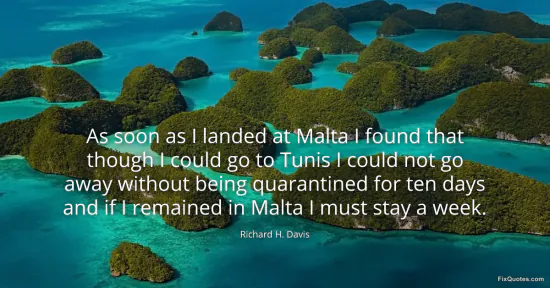 Davis, Richard H. "As soon as I landed at Malta I found that though I could go to Tunis I could not go away without being quarantined for ten days and if I remained in Malta I must stay a week." FixQuotes. January 15, 2026. https://fixquotes.com/quotes/as-soon-as-i-landed-at-malta-i-found-that-though-155886/.