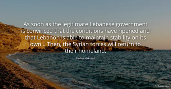 al-Assad, Bashar. (2026, January 17). As soon as the legitimate Lebanese government is convinced that the conditions have ripened and that Lebanon is able to maintain stability on its own... Then, the Syrian forces will return to their homeland. FixQuotes. https://fixquotes.com/quotes/as-soon-as-the-legitimate-lebanese-government-is-40456/