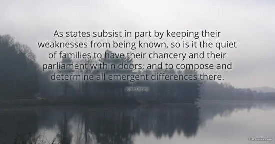 "As states subsist in part by keeping their weaknesses from being known, so is it the quiet of families to have their chancery and their parliament within doors, and to compose and determine all emergent differences there." FixQuotes, 18 Jan. 2026, https://fixquotes.com/quotes/as-states-subsist-in-part-by-keeping-their-8417/. Accessed 12 Feb. 2026.