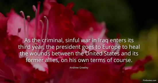 Greeley, Andrew. (2026, January 17). As the criminal, sinful war in Iraq enters its third year, the president goes to Europe to heal the wounds between the United States and its former allies, on his own terms of course. FixQuotes. https://fixquotes.com/quotes/as-the-criminal-sinful-war-in-iraq-enters-its-45666/