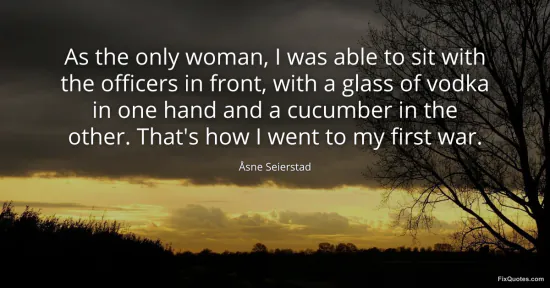 Seierstad, Åsne. (2026, January 17). As the only woman, I was able to sit with the officers in front, with a glass of vodka in one hand and a cucumber in the other. That's how I went to my first war. FixQuotes. https://fixquotes.com/quotes/as-the-only-woman-i-was-able-to-sit-with-the-32779/