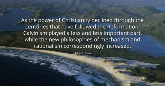 Cram, Ralph A. (2026, January 16). As the power of Christianity declined through the centuries that have followed the Reformation, Calvinism played a less and less important part, while the new philosophies of mechanism and rationalism correspondingly increased. FixQuotes. https://fixquotes.com/quotes/as-the-power-of-christianity-declined-through-the-128891/