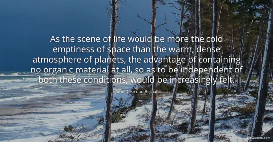 Bernal, John Desmond. "As the scene of life would be more the cold emptiness of space than the warm, dense atmosphere of planets, the advantage of containing no organic material at all, so as to be independent of both these conditions, would be increasingly felt." FixQuotes. January 17, 2026. https://fixquotes.com/quotes/as-the-scene-of-life-would-be-more-the-cold-59058/.