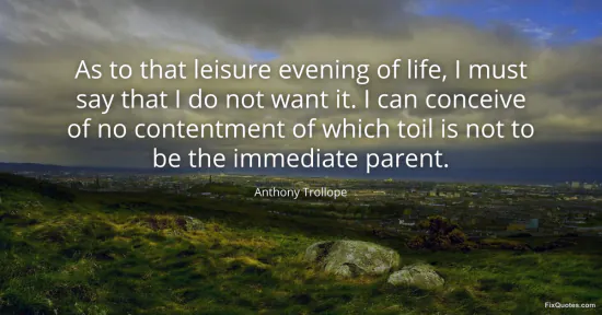 Trollope, Anthony. "As to that leisure evening of life, I must say that I do not want it. I can conceive of no contentment of which toil is not to be the immediate parent." FixQuotes. January 17, 2026. https://fixquotes.com/quotes/as-to-that-leisure-evening-of-life-i-must-say-39006/.
