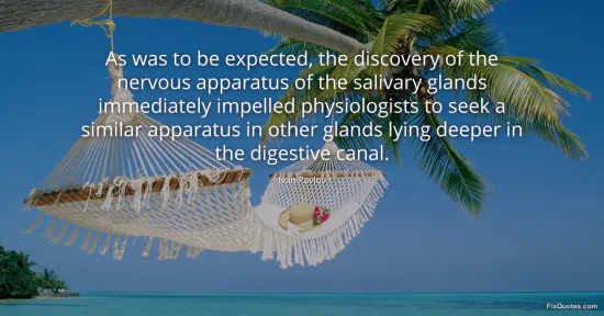 Pavlov, Ivan. (2026, January 17). As was to be expected, the discovery of the nervous apparatus of the salivary glands immediately impelled physiologists to seek a similar apparatus in other glands lying deeper in the digestive canal. FixQuotes. https://fixquotes.com/quotes/as-was-to-be-expected-the-discovery-of-the-79877/