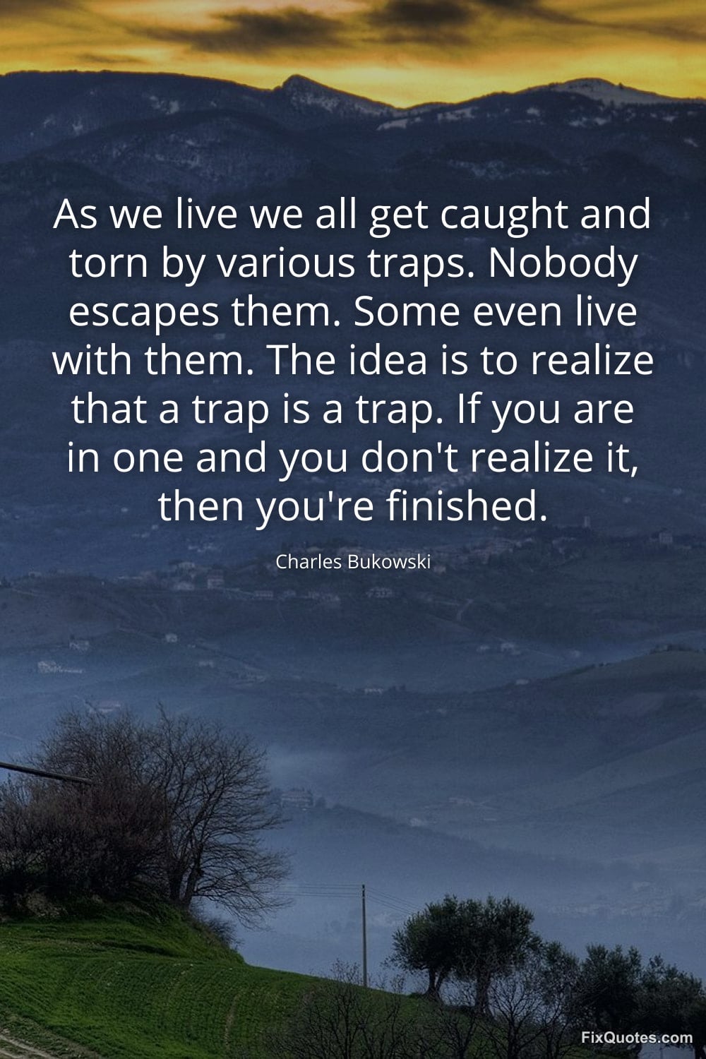 Bukowski, Charles. (2026, February 10). As we live we all get caught and torn by various traps. Nobody escapes them. Some even live with them. The idea is to realize that a trap is a trap. If you are in one and you don't realize it, then you're finished. FixQuotes. https://fixquotes.com/quotes/as-we-live-we-all-get-caught-and-torn-by-various-185244/