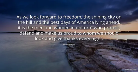 Hayes, Robin. (2026, January 15). As we look forward to freedom, the shining city on the hill and the best days of America lying ahead, it is the men and women in uniform who protect, defend and make us proud to whom we should look and give thanks every night. FixQuotes. https://fixquotes.com/quotes/as-we-look-forward-to-freedom-the-shining-city-on-161571/