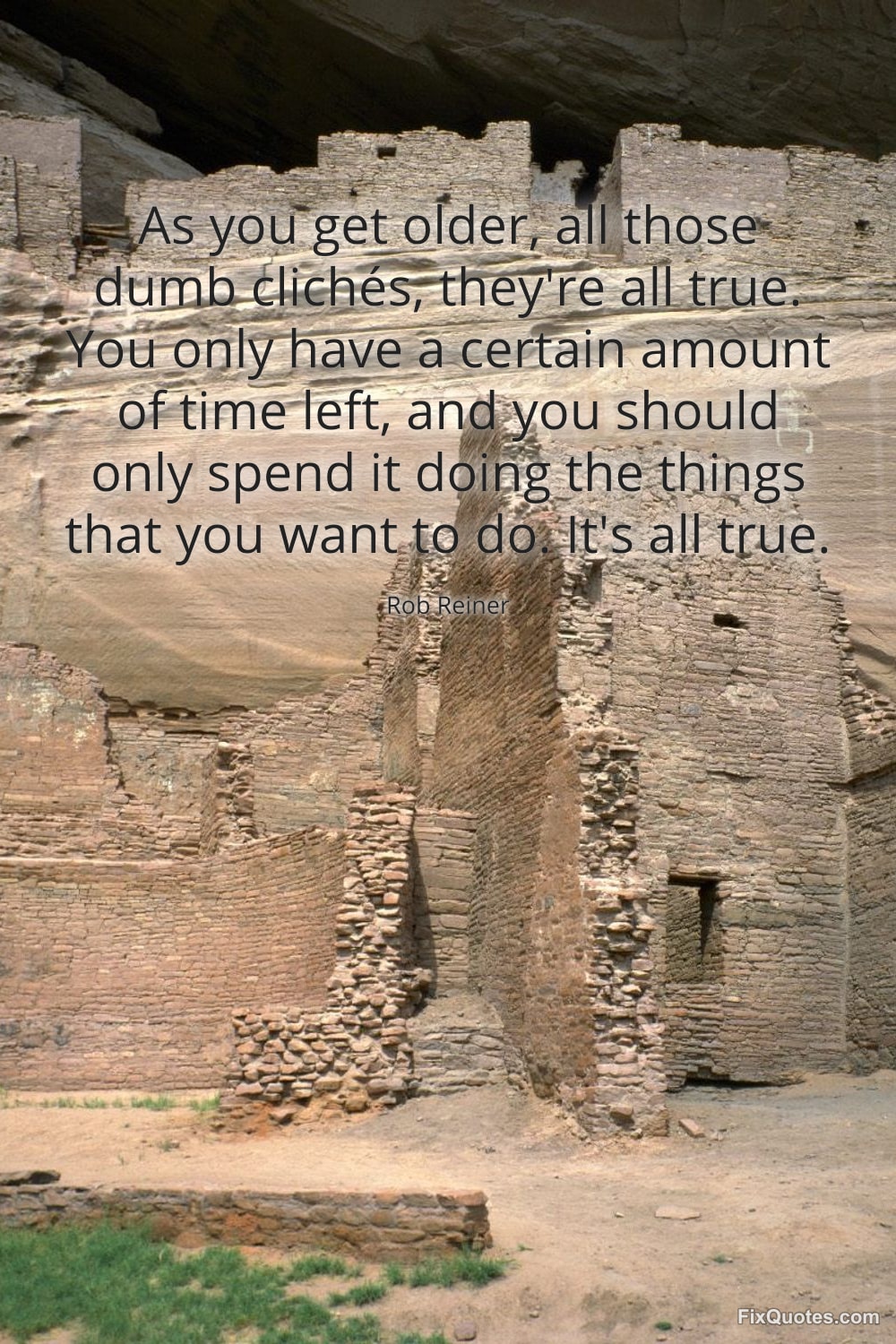 Reiner, Rob. "As you get older, all those dumb clichés, they're all true. You only have a certain amount of time left, and you should only spend it doing the things that you want to do. It's all true." FixQuotes. January 11, 2026. https://fixquotes.com/quotes/as-you-get-older-all-those-dumb-cliches-theyre-173683/.