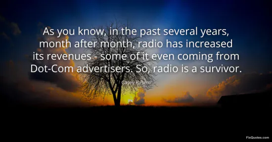 Kasem, Casey. (2026, January 17). As you know, in the past several years, month after month, radio has increased its revenues - some of it even coming from Dot-Com advertisers. So, radio is a survivor. FixQuotes. https://fixquotes.com/quotes/as-you-know-in-the-past-several-years-month-after-46882/