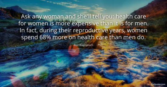 Blagojevich, Rod. "Ask any woman and she'll tell you: health care for women is more expensive than it is for men. In fact, during their reproductive years, women spend 68% more on health care than men do." FixQuotes. January 16, 2026. https://fixquotes.com/quotes/ask-any-woman-and-shell-tell-you-health-care-for-122546/.