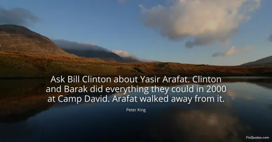 King, Peter. "Ask Bill Clinton about Yasir Arafat. Clinton and Barak did everything they could in 2000 at Camp David. Arafat walked away from it." FixQuotes. January 17, 2026. https://fixquotes.com/quotes/ask-bill-clinton-about-yasir-arafat-clinton-and-64057/.